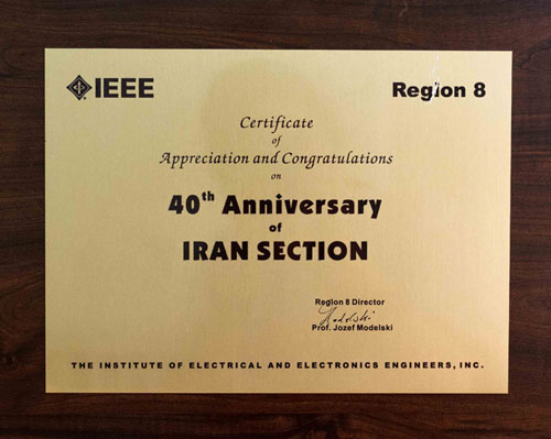 This certificate of appreciation is awarded to IEEE Iran Section to congratulate on 40th Anniversary of Iran Section.