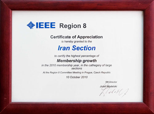 Iran Section honored to win Region 8 Membership Growth Award of 2010 because of the highest percentage of membership growth in the 2010 membership year, in the category of large sections.