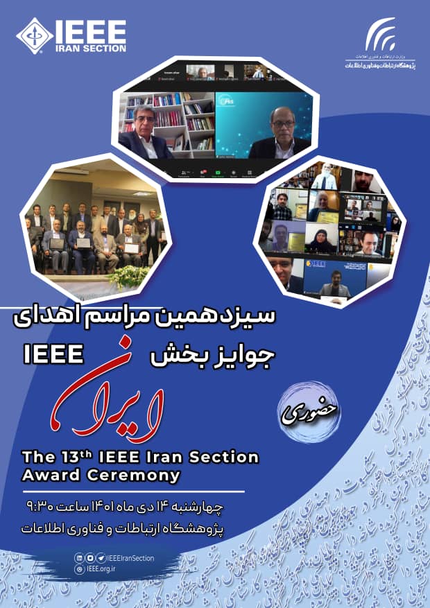 ضمن تشكر از تمامي فرهيختگاني كه فعالانه در سیزدهمین دوره جوايز بخش ايران استاد پیشکسوت در امر آموزش و پژوهش، استاد محمد حکاک، استاد پرویز جبه دار مارالانی، استاد کارلوکس، استادمهدی فخرایی، استاد مرتضی انواری، پژوهشگر جوان، شاخه برتر دانشجويي، پايان‌نامه‌هاي برتر در مقاطع دكترا، كارشناسي‌ارشد، كارشناسي، كارآفرين برتر، مهندس پیشکسوت و زنان در مهندسي) شركت نمودند، به آگاهي مي رساند مراسم سیزدهمين دوره تقدير و اهداء جوايز بخش ايران در روز چهارشنبه 14/10/1401 ساعت 9:30 با حضور کميته اجرايي بخش ايران، اساتيد پيشکسوت در حوزه برق و کامپيوتر، کارآفرينان و پيشکسوتان درحوزه صنعت و مشاورين و روساي شاخه هاي بخش ايران بصورت حضوری در پژوهشگاه ارتباطات و فناوری اطلاعات، ساختمان اصلی، طبقه دوم ، تالار اتابکی برگزار خواهد شد. بدين‌وسيله از تمامي اعضاي محترم بخش ايران براي شرکت در اين مراسم دعوت بعمل مي‌آيد